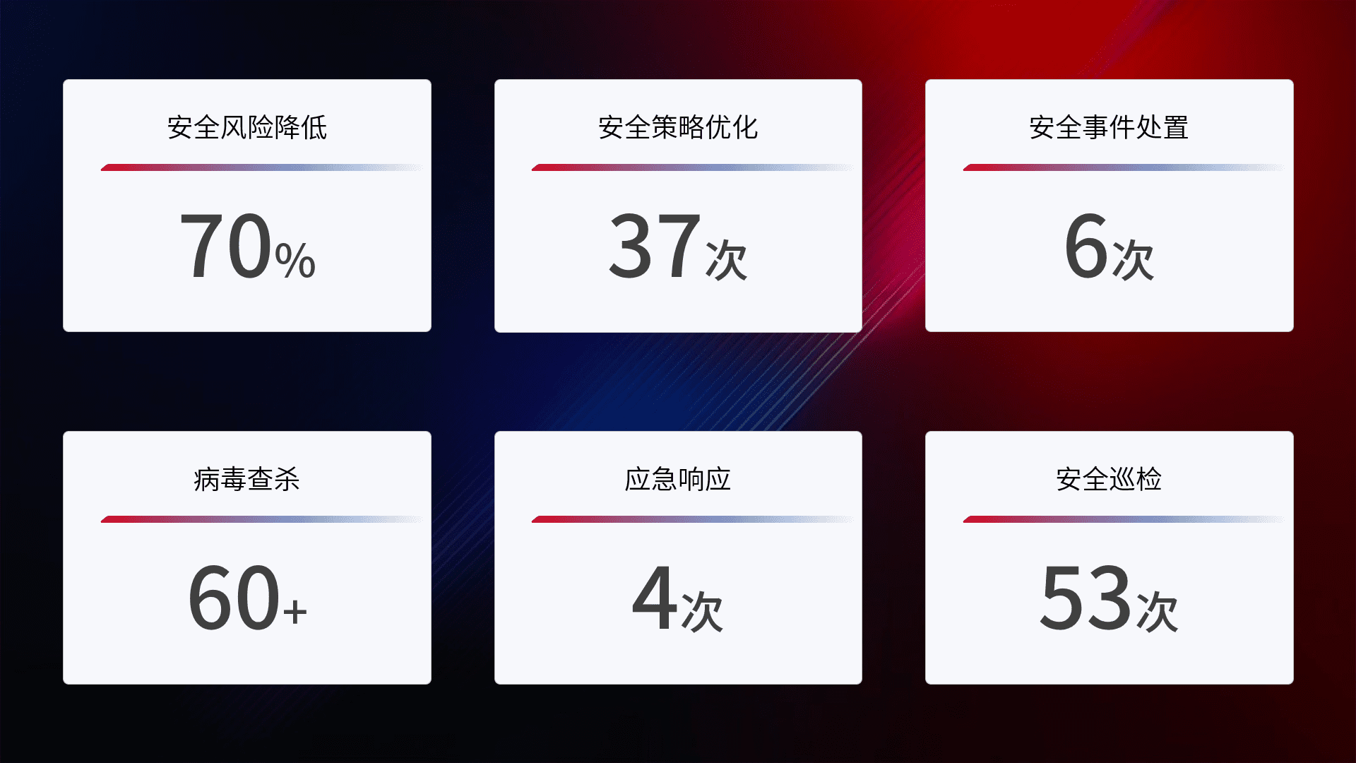 提供全面的安全事件报告体系,,包括处置报告、、、、周报、、、、季度和年度总结,,,,结合持续监控,,帮助客户深入了解网络安全状况。。